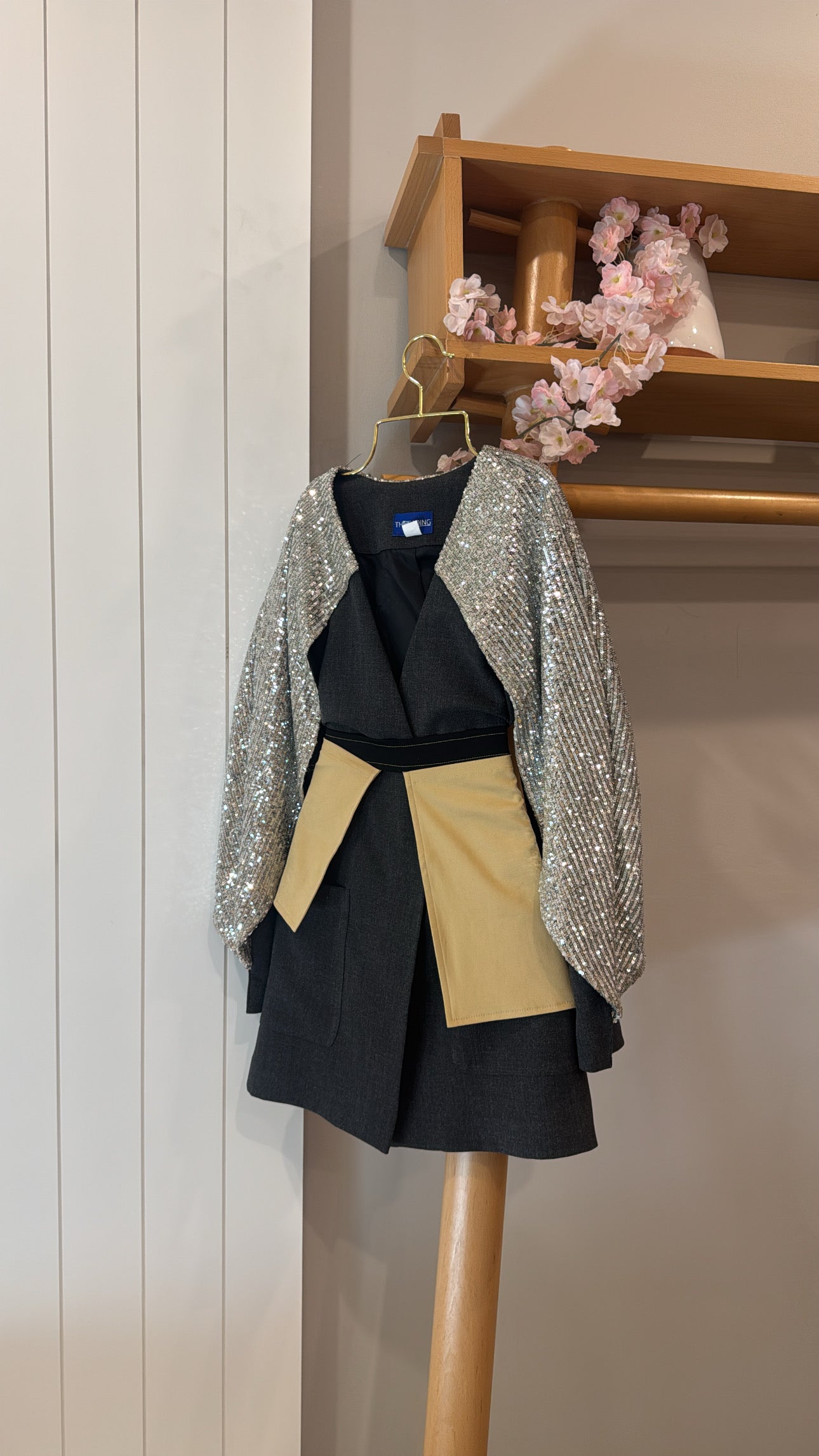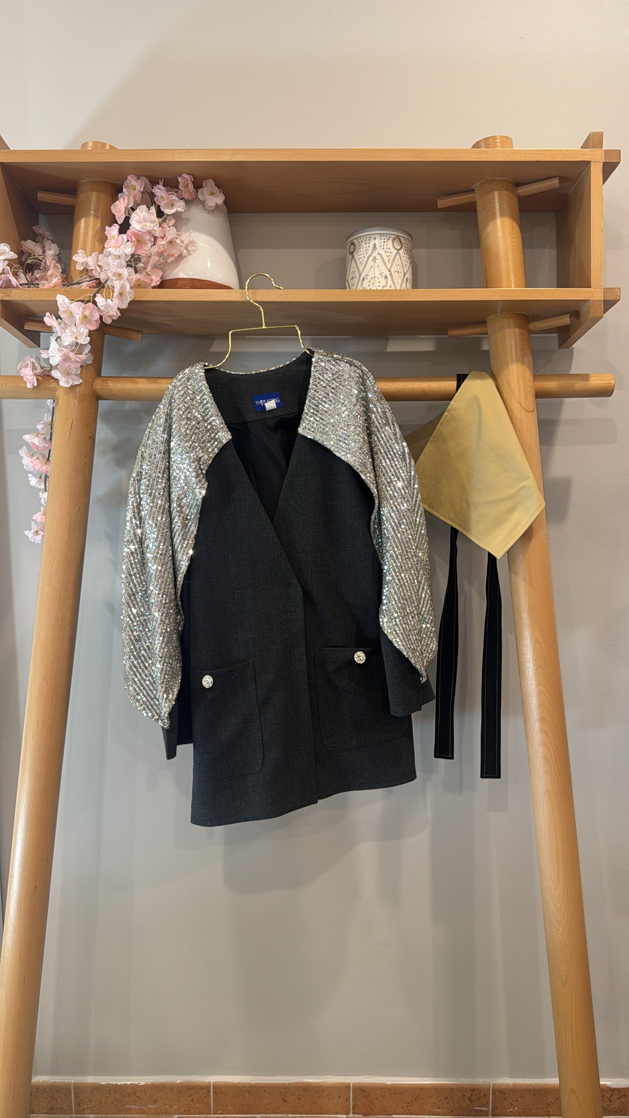 New blazer with a glittery sleeves that looks like a cape.